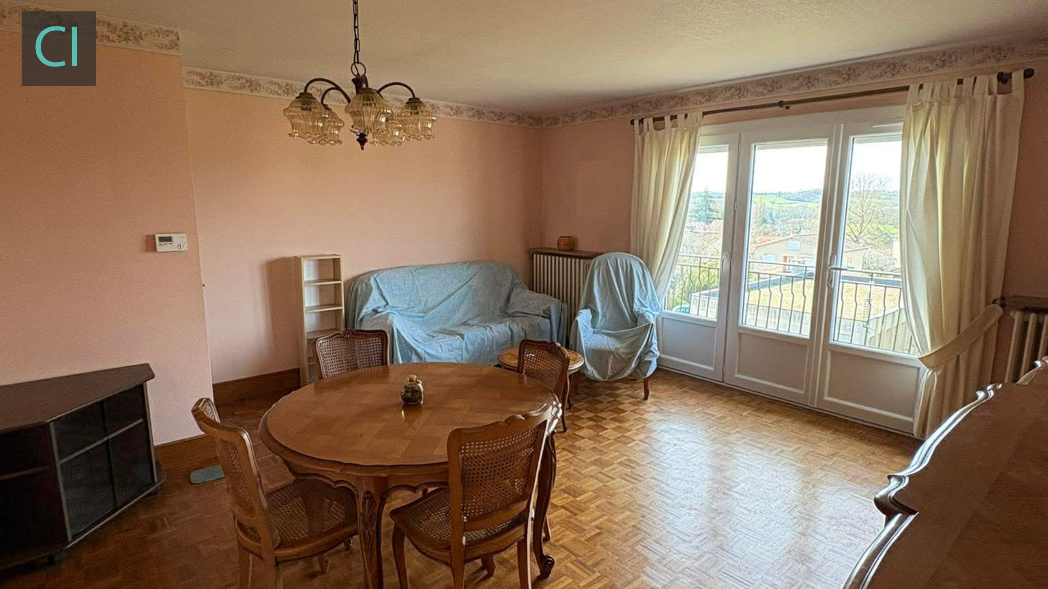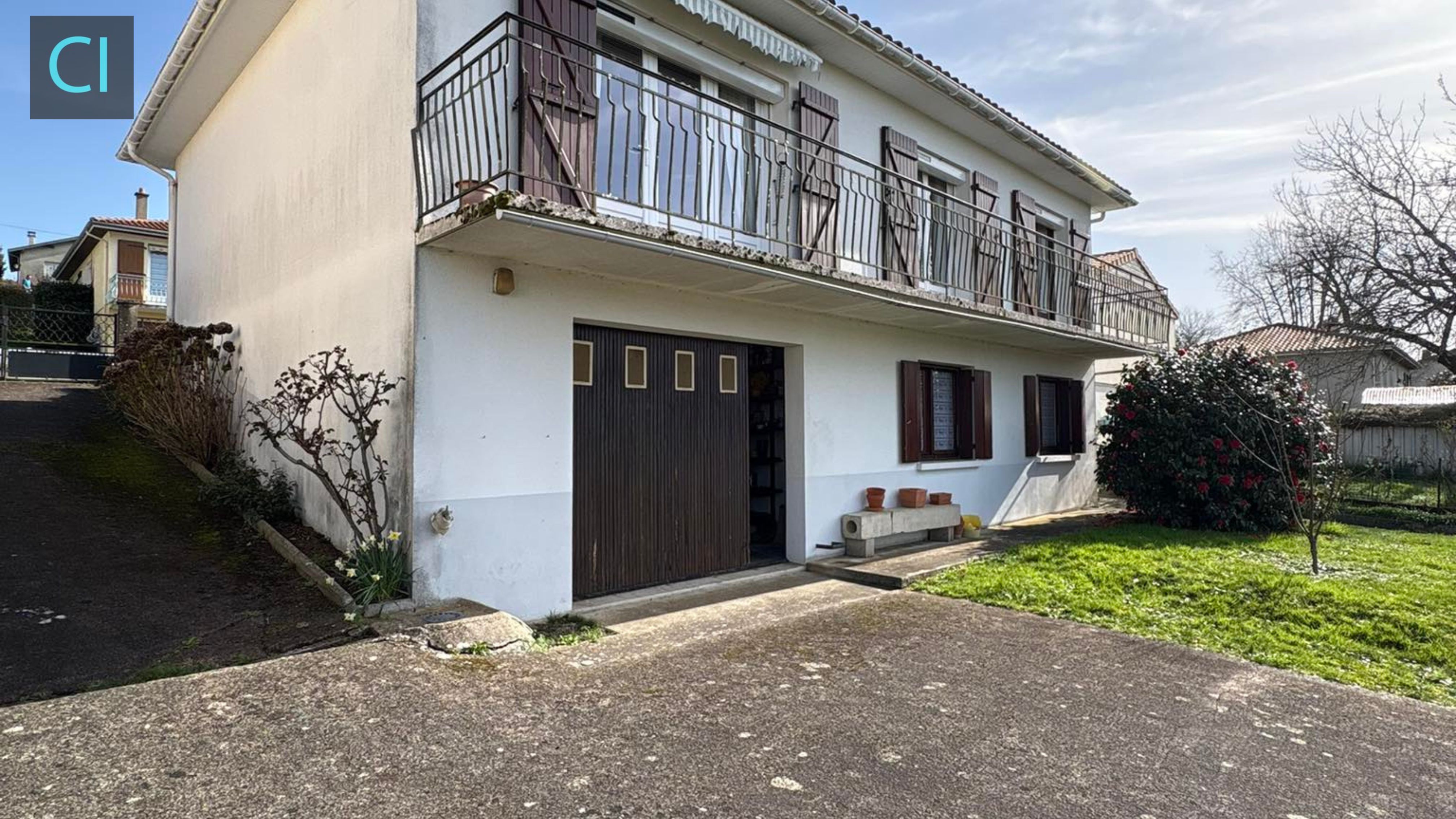 Le bien dispose d’une grande terrasse faisant office d’entrée accueillante et d’un balcon sur toute la longueur de la façade, idéal pour profiter de la vue sur la ville. Un garage est accessible via une allée bétonnée sur le côté.